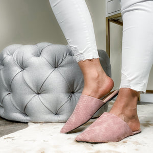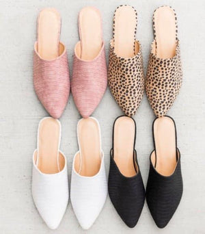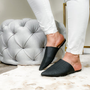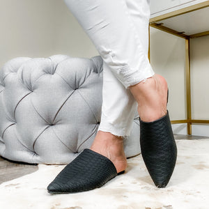Vegan leather slides feature a pointed toe. • Heel measures 0.5" • Vegan friendly, man made materials • Non-skid sole • Imported