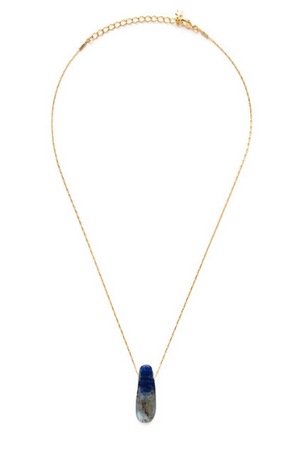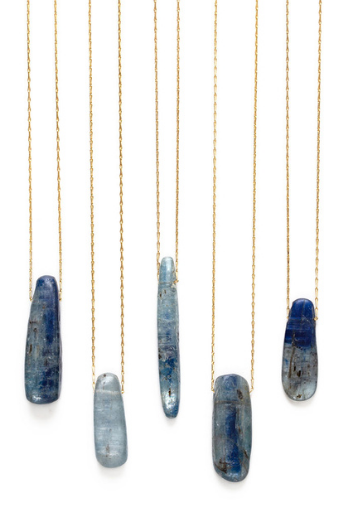 One of a kind rock, Kyanite hangs from a 16"+ 2" extender Gold Barley chain. Fun facts: Blue Kyanite opens the throat chakra, encouraging communication and self-expression.